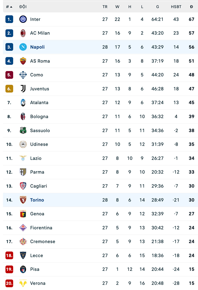 Với chiến thắng này, Napoli đã có 56 điểm sau 28 trận và tiếp tục giữ vững vị trí thứ ba trên bảng xếp hạng Serie A. Họ kém đội nhì bảng AC Milan 1 điểm nhưng đá nhiều hơn 1 trận. Về phía Torino, thất bại này khiến họ tiếp tục giậm chân ở vị trí thứ 14 với 30 điểm sau 28 vòng đấu.