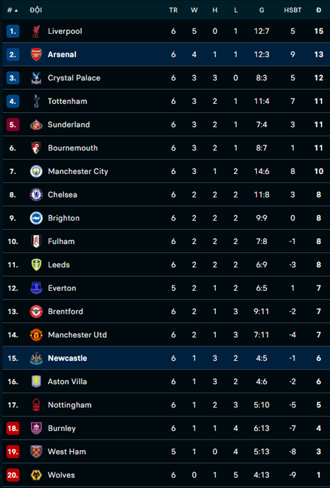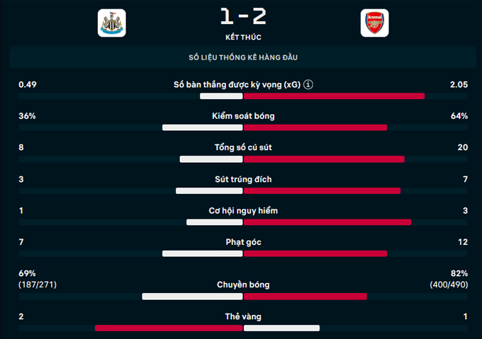Đến phút bù giờ thứ 7, Arsenal hoàn tất cú ngược dòng trước Newcastle. Từ cú đá phạt góc của Odegaard, trung vệ Gabriel Magalhaes đã bật cao đánh đầu, ấn định tỉ số 2-1 cho Pháo thủ. Thắng trận, Arsenal có 13 điểm và trở lại ngôi nhì bảng. Khoảng cách giữa họ và ĐKVĐ Liverpool giờ chỉ còn 2 điểm.