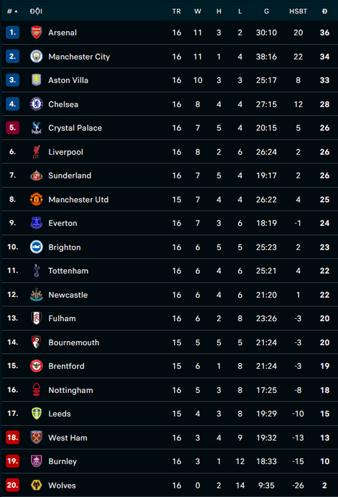 | TT | Đội bóng | Trận | +/- | Điểm |