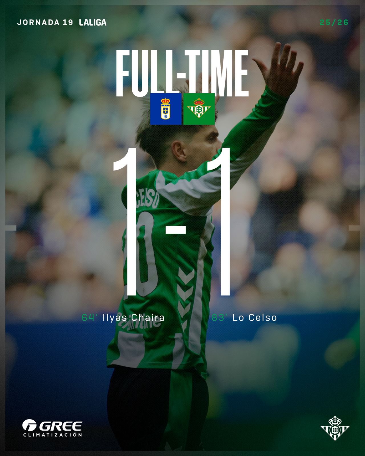 Sang tới hiệp hai, Betis tiếp tục tấn công nhưng Lo Celso chưa thể thắng được thủ môn đối phương. Phút 64, Oviedo bất ngờ có được bàn mở tỉ số khi Ilyas Chaira tung cú sút chuẩn xác từ ngoài vòng cấm.