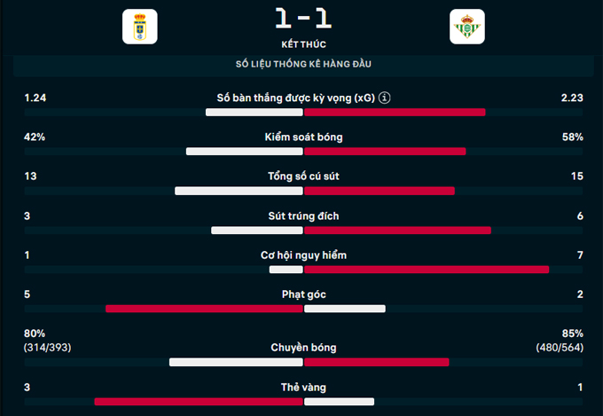 Kết quả Oviedo 1-1 Betis: Trận hòa đáng tiếc