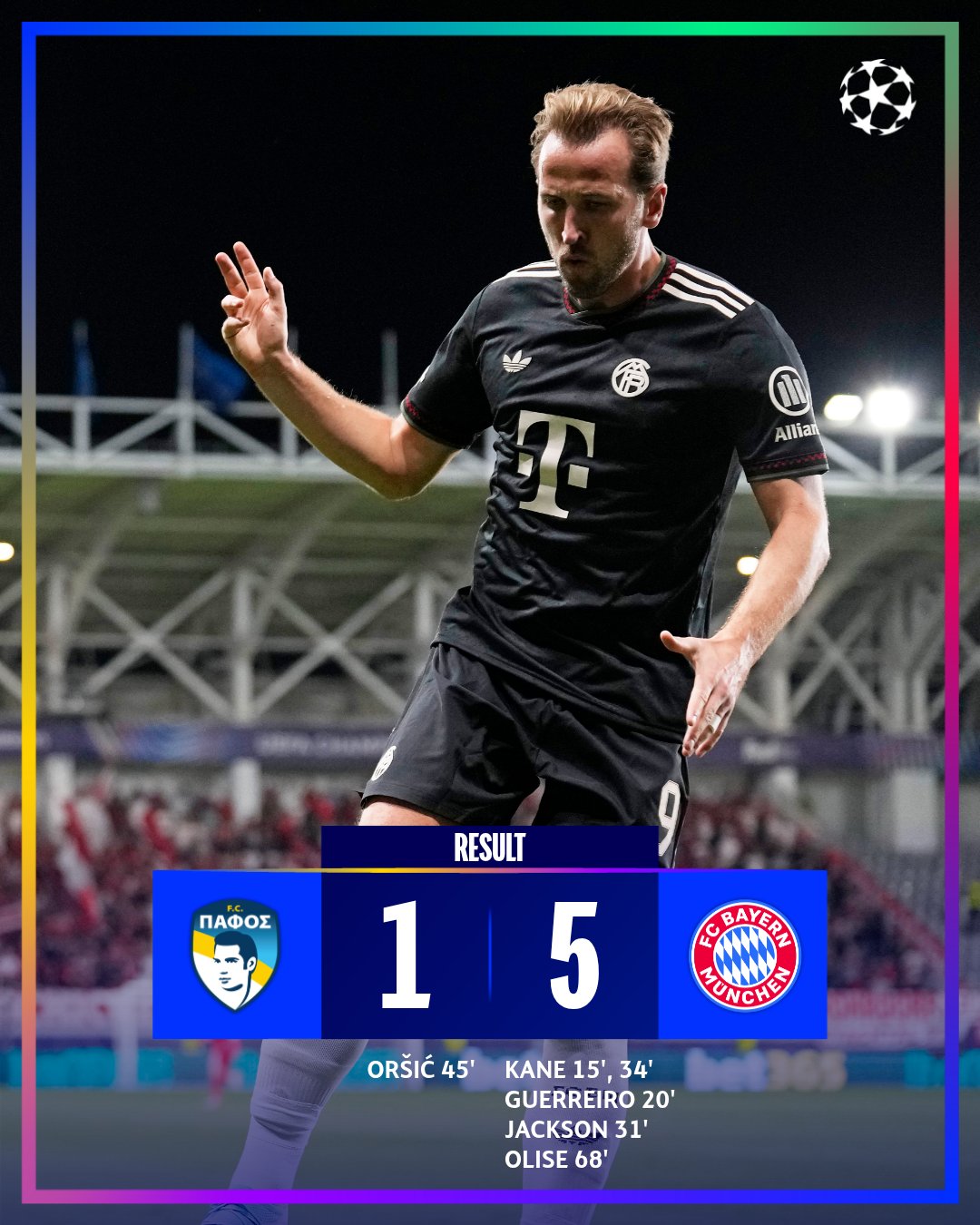 Bayern: Kane (15', 34'), Guerreiro (20'), Jackson (31'), Olise (69')