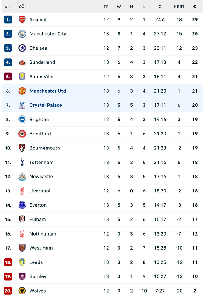 | TT | Đội bóng | Trận | +/- | Điểm |