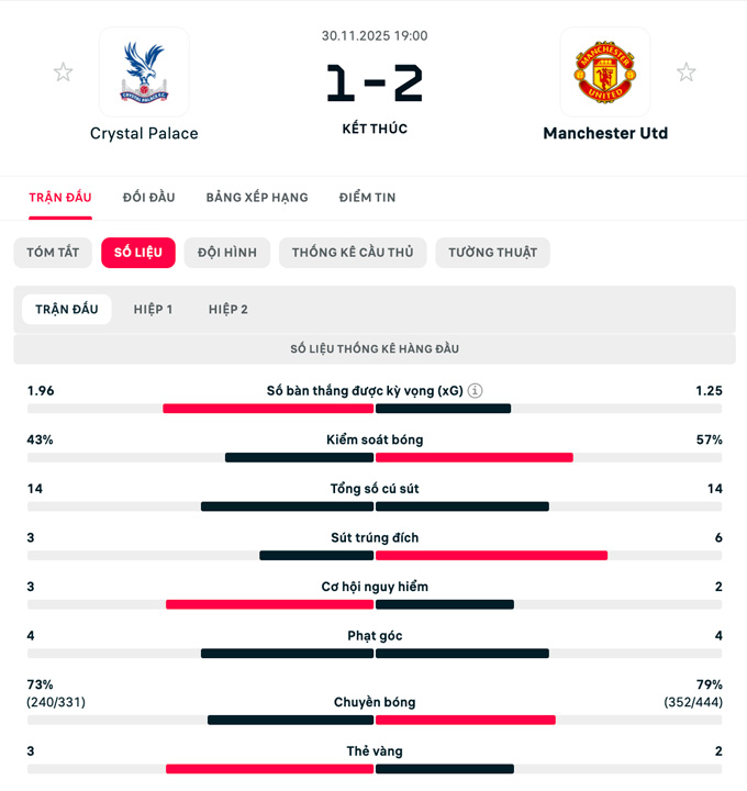 MU đang rất muốn tìm lại mạch thắng sau khi hoà 2 và thua 1 trong 3 trận gần nhất. Tuy nhiên, làm khách trên sân của Palace chưa bao giờ là dễ dàng đối với Quỷ đỏ trong những năm gần đây. Theo thống kê trước trận đấu này, Đại bàng đã bất bại 4 trận gần nhất gặp MU, thắng đến 3 trận và chỉ hòa 1, đồng thời giữ sạch lưới cả 4 trận ấy.