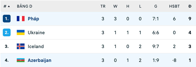 Kết quả chung cuộc của trận đấu này là 3-0 nghiêng về phía ĐT Pháp. Với 3 trận toàn thắng, Pháp đang dẫn đầu bảng D, hơn đội xếp thứ hai là Ukraine tới 5 điểm.