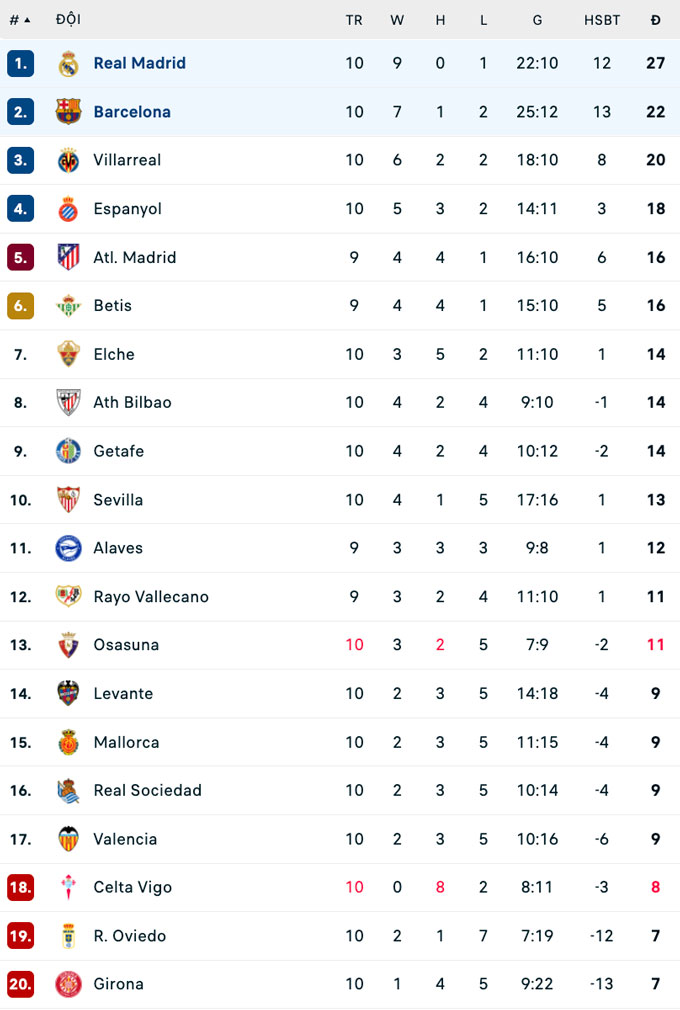 | TT | Đội bóng | Trận | +/- | Điểm |