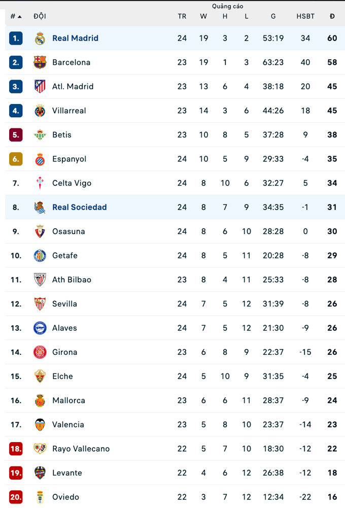 | La Liga - Vòng 24 | |||