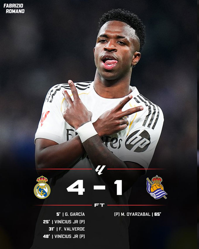 Real Madrid: Gonzalo Garcia (5'), Vinicius (25'-pen, 48'-pen), Valverde (31')