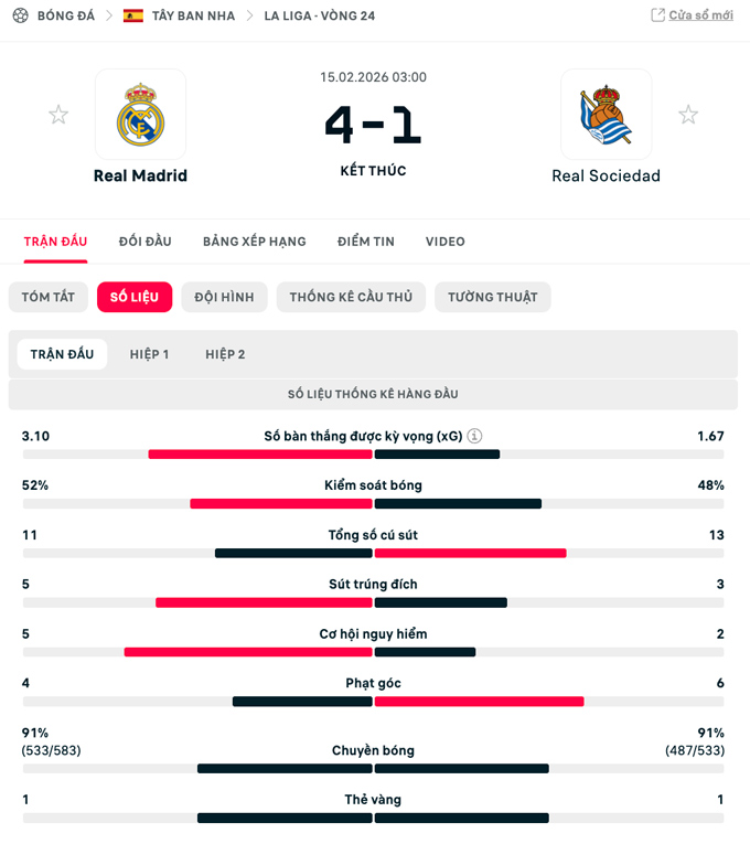 Kết quả cuối cùng của trận đấu này là 4-1, Real Madrid tạm lên đầu bảng La Liga với 2 điểm nhiều hơn Barca, đội sẽ đối đầu với Girona vào lúc 3h ngày 17/2)