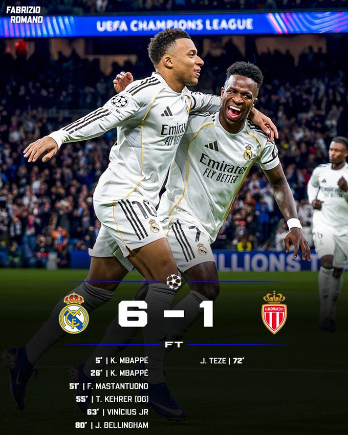 Real Madrid: Mbappe (5', 26'), Mastantunono (51'), Kehrer (55-phản lưới), Vinicius (63'), Bellingham (80')