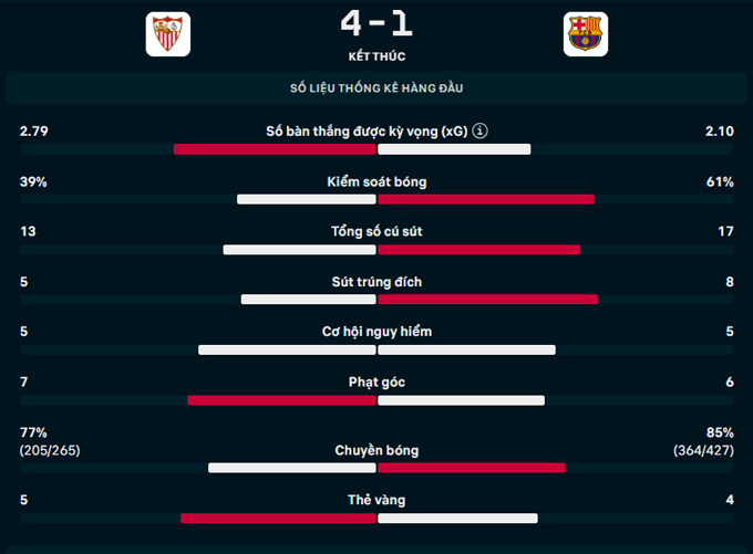 Đây là chiến thắng đầu tiên sau tròn 10 năm của Sevilla trước Barca ở La Liga và họ đã leo một mạch lên top 4 trên BXH.