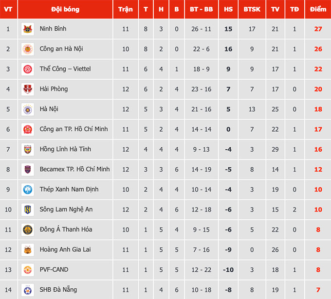 | TT | Đội bóng | Trận | +/- | Điểm |