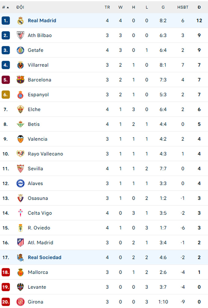 Chung cuộc, Real Madrid đánh bại Sociedad 2-1 để duy trì mạch toàn thắng tại La Liga 2025/26. Kết quả này giúp Los Blancos đứng đầu BXH với 12 điểm tuyệt đối. Ở vòng 5, Real Madrid sẽ tiếp đón Espanyol trên sân nhà. Trước đó, họ sẽ đụng độ Marseille tại lượt trận đầu tiên vòng phân hạng Champions League vào ngày 17/9.
