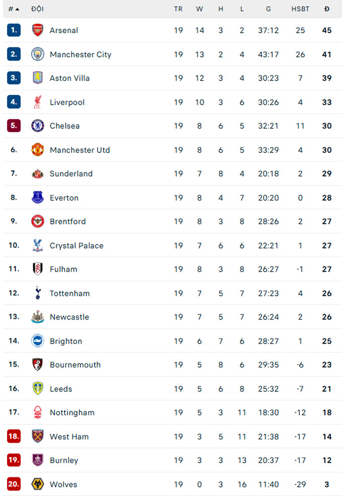 | Premier League - Vòng 19 | |||