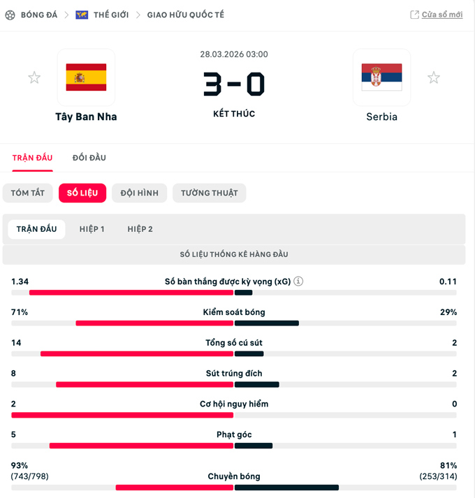 VIDEO: Tây Ban Nha 3-0 SerbiaNgôi sao sáng nhất trận đấu là Mikel Oyarzabal. Tiền đạo của Real Sociedad mở tỷ số ở phút 16 bằng cú dứt điểm uy lực sau pha phối hợp thông minh khởi nguồn từ T năng trẻ Lamine Yamal.