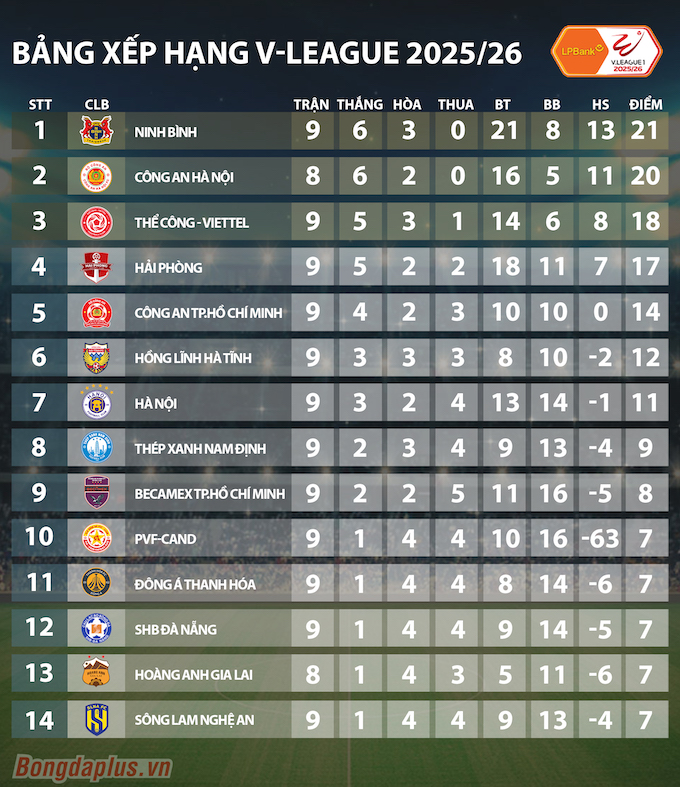 | TT | Đội bóng | Trận | +/- | Điểm |