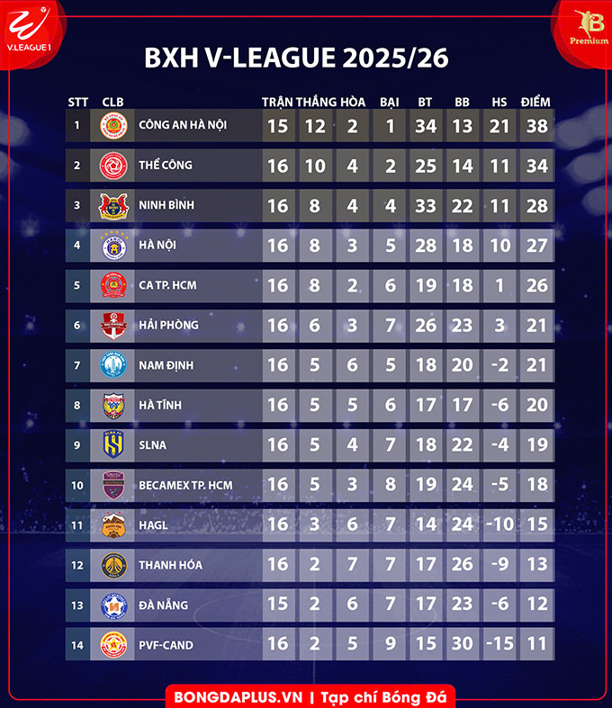 Một ngày trước trận đấu với Hải Phòng trên sân Hàng Đẫy thuộc vòng 16 V.League 2025/26 diễn ra, Thể Công Viettel nhận tin CLB Công an Hà Nội đánh bại Ninh Bình ngay tại “pháo đài” đối thủ. Điều đó đồng nghĩa, nếu không đánh bại thầy trò HLV Chu Đình Nghiêm, đoàn quân của ông Velizar Popov sẽ bị đại diện ngành lực lượng vũ trang nới rộng khoảng cách điểm số trong cuộc đua đến ngôi vương.