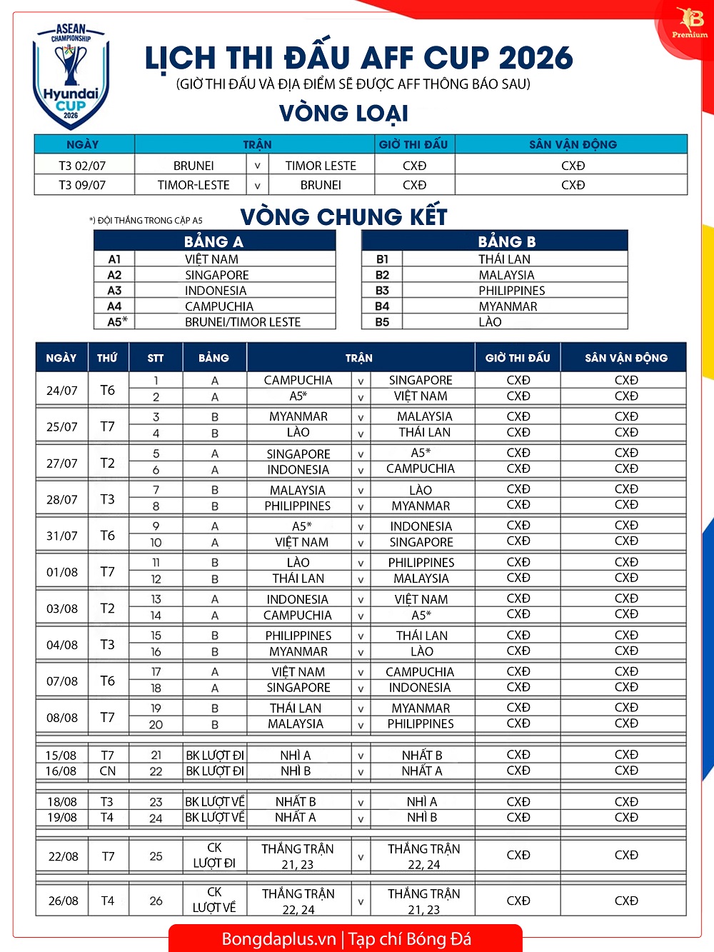 AFF Cup 2026 sẽ bắt đầu từ ngày 24/7 tới. Thể thức thi đấu vẫn giữ nguyên như các giải gần đây. Theo kết quả bốc thăm, ĐT Việt Nam nằm ở bảng A cùng với các đội tuyển Indonesia, Campuchia, Singapore và đội thắng trong trận đấu play-off giữa Brunei và Timor Leste.