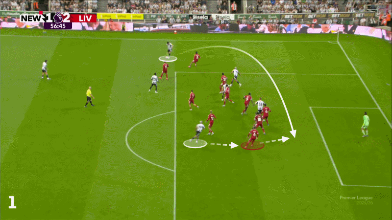 Khởi đầu không chắc chắn trước Bournemouth tại Anfield đã tạo ra tiền đề, với việc Kerkez phải chịu trách nhiệm trong bàn thắng đầu tiên của Newcastle sau khi không xử lý được quả tạt đến ở cột xa. Như được thể hiện bên dưới (khung hình hai), Kerkez hoàn toàn thất bại trong việc bật nhảy tranh chấp và thua Bruno Guimaraes trong một pha không chiến.