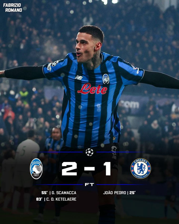 Tuy nhiên, một đội bóng thành London khác là Chelsea lại phải nhận thất bại trên sân của Atalanta. Joao Pedro mở tỷ số cho The Blues ở phút 25 nhưng Scamacca và De Ketelaere đã ghi bàn ở các phút 55 và 83 để giúp đội bóng Italia ngược dòng giành chiến thắng 2-1.