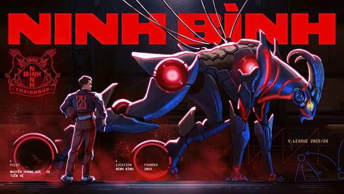 Ninh Bình: Tân binh của V.League 2025/26 xuất hiện với tạo hình robot mang hình hài của chú dê núi đặc trưng của vùng đất cố đô, kết hợp cùng cờ hội, tạo nên cảm giác vừa truyền thống mà cũng hiện đại, với những bước chân thần tốc tiến về phía trước. Không thể thiếu là đội trưởng Hoàng Đức – tiền vệ hàng đầu bóng đá Việt Nam ở thời điểm này.