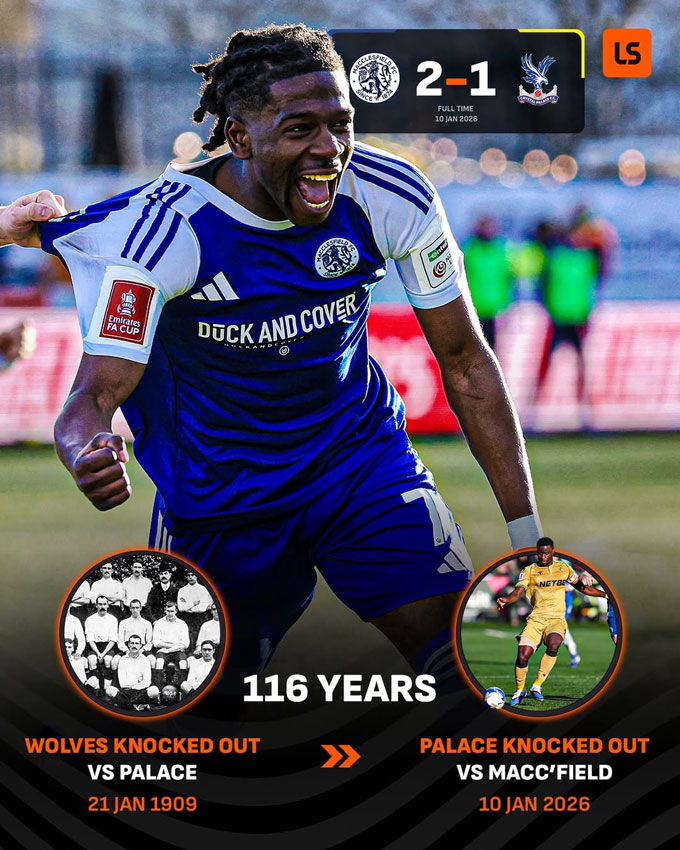 1. Macclesfield 2-1 Crystal Palace (Vòng 3, năm 2026)