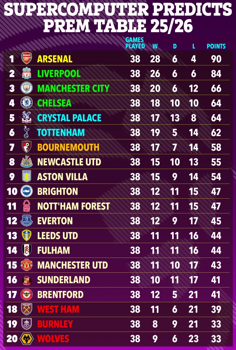 Trong khi đó, Liverpool được dự đoán sẽ về đích thứ 2 với 84 điểm. Man City sẽ cán đích thứ 3 nhưng ước tính chỉ giành 66 điểm và vị trí còn lại của Top 4 thuộc về Chelsea với 64 điểm.