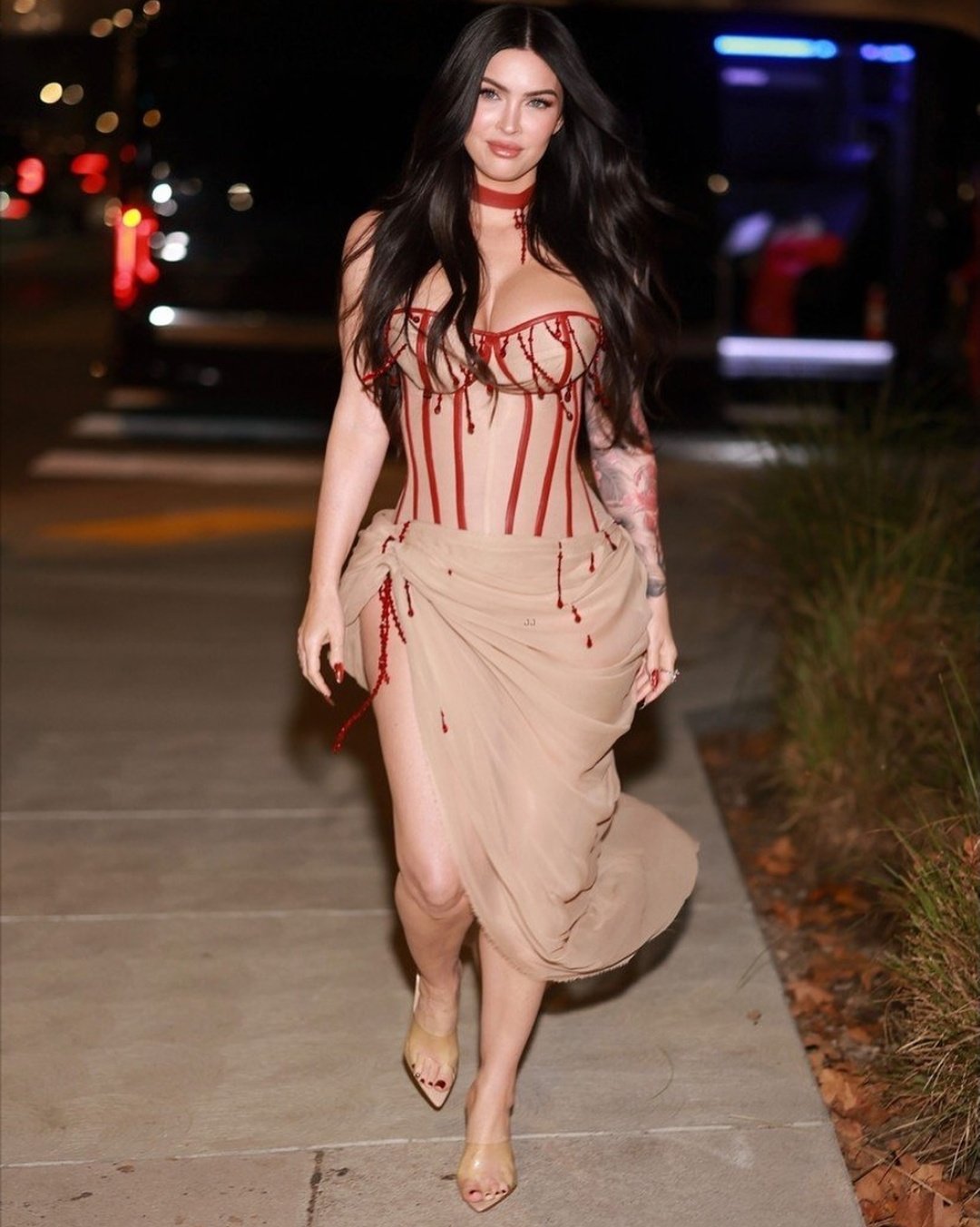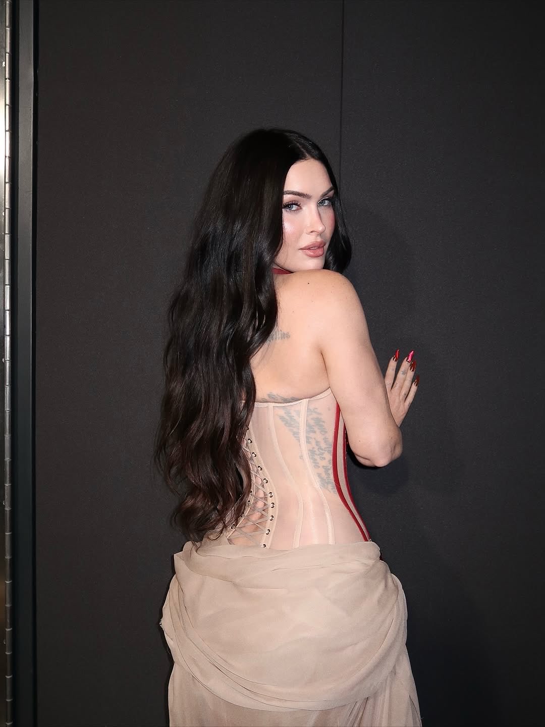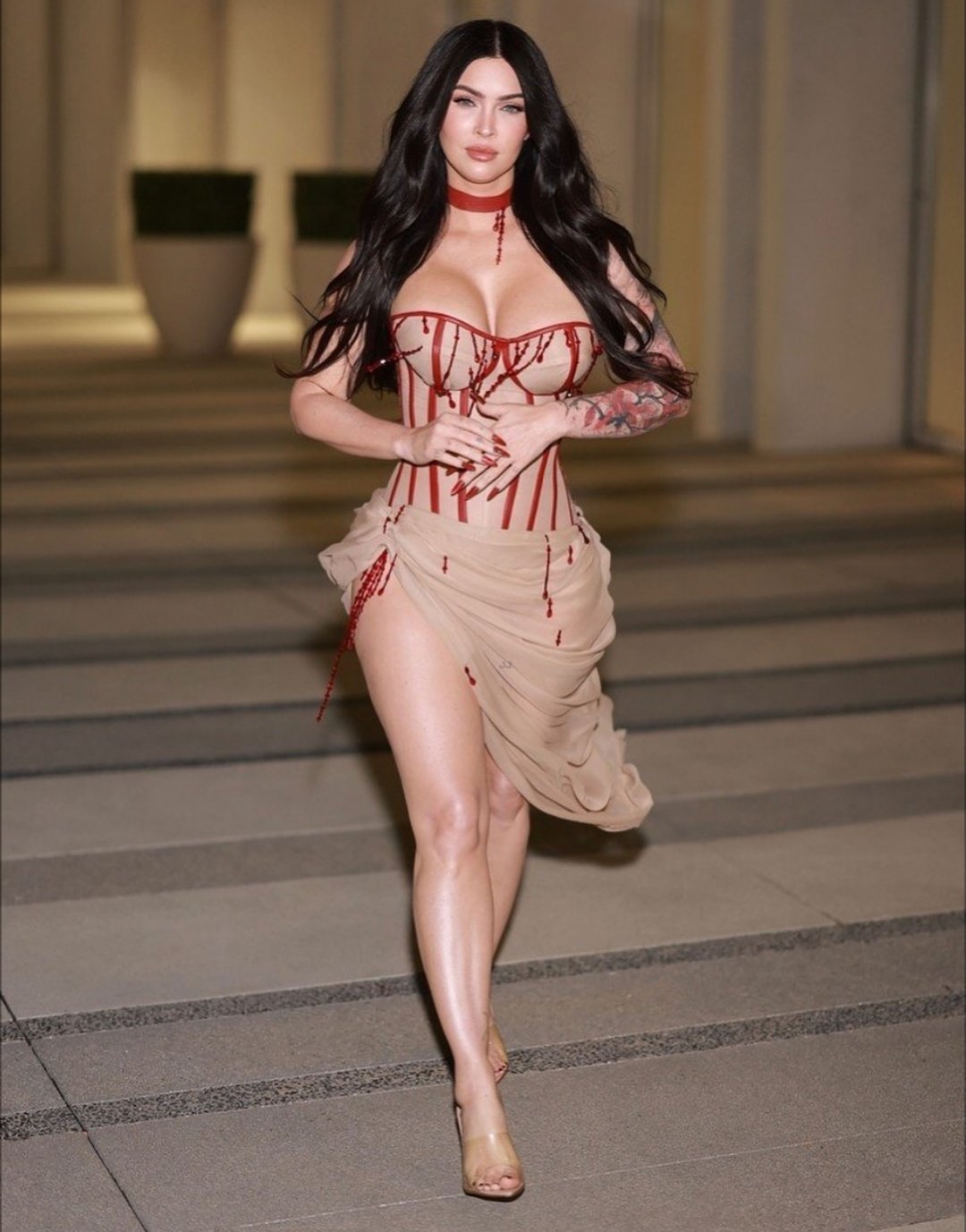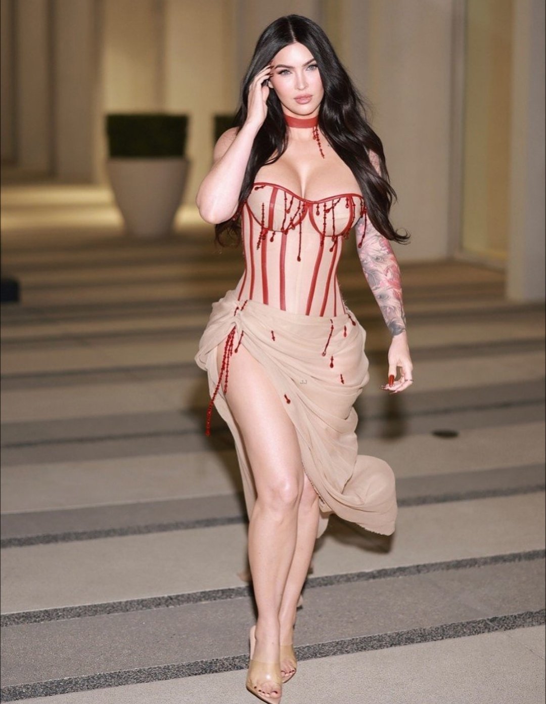 Xuất hiện tại sự kiện, Megan diện trang phục gợi cảm với chiếc corset màu nude tôn vòng một tròn trịa đầy hấp dẫn cùng eo thon. Điểm nhấn của trang phục là các chi tiết sọc đỏ, đính hạt cườm lấp lánh. Phần tà váy xẻ cao cũng giúp diễn viên kheo khéo đôi chân dài.