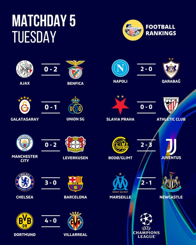 Ở các trận đấu còn lại, Galatasaray để thua 0-1 ngay trên sân nhà trước Union St.Gilloise, Dortmund đại thắng Villarreal với tỷ số 4-0, Chelsea thắng Barca 3-0, Man City thua đau Leverkusen 0-2 còn Slavia Prague và Bilbao hoà nhau không bàn thắng.