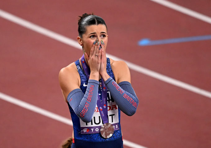 Amy Hunt đã không thể kìm nén cảm xúc sau khi giành huy chương bạc nội dung 200m tại giải vô địch Điền kinh thế giới ở Tokyo. Nữ VĐV 23 tuổi bật khóc khi nhìn thấy tên mình trên bảng điện tử, sau khi vượt qua Sherica Jackson (Jamaica) để cán đích với thành tích 22,14 giây, chỉ kém người giành HC vàng.