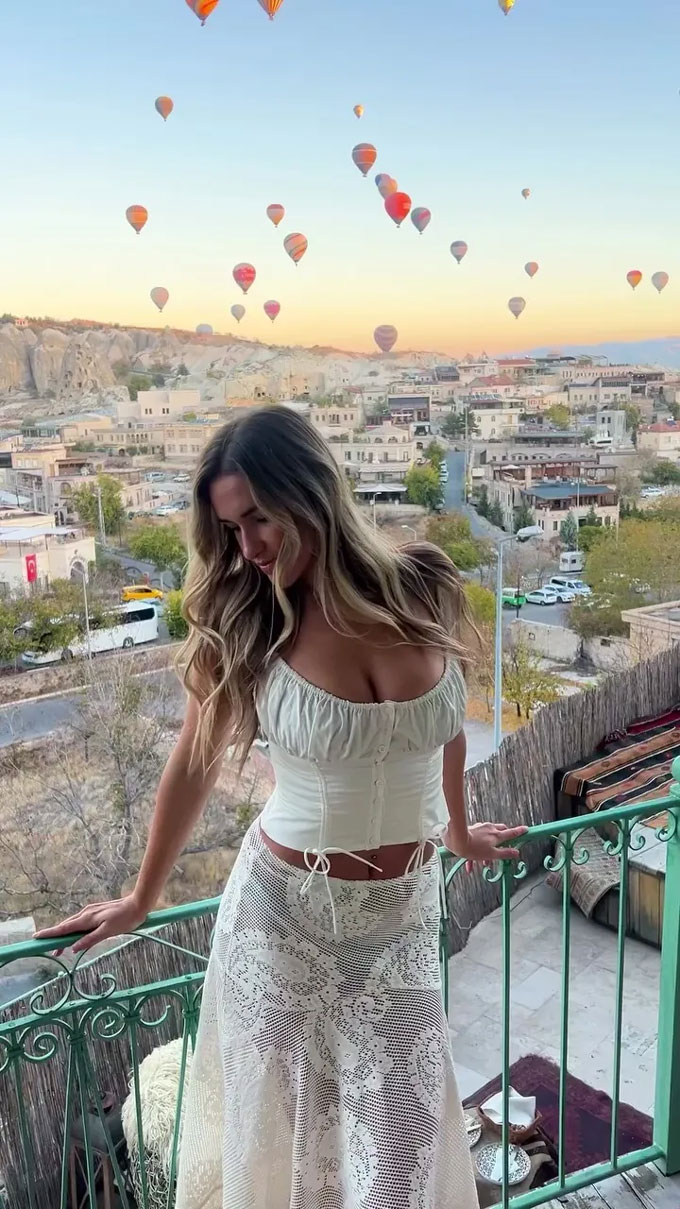 Bắt đầu chuyến nghỉ dưỡng, Kayla khoe dáng trên ban công với khung cảnh hùng vĩ phía sau, nơi những thung lũng đá và bầu trời Thổ Nhĩ Kỳ trải dài. Cô thưởng cho mình một bữa ăn thịnh soạn để nạp năng lượng, trước khi tận hưởng khung cảnh hàng trăm khinh khí cầu bay lên không, một trong những trải nghiệm đặc trưng của Cappadocia.