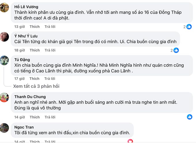 Dưới các bài đăng tưởng niệm, nhiều bình luận khiến người đọc nghẹn lòng. T khoản Trịnh Quốc Đạt viết: “Lâu lắm mới nghe lại tên anh, không ngờ là trong hoàn cảnh này. Xin chia buồn cùng gia đình, mong anh ra đi thanh thản.” Một cổ động viên khác nhớ về “cặp đôi Trung Vĩnh – Minh Nghĩa” từng làm nên sức sống cho hàng công Đồng Tháp.