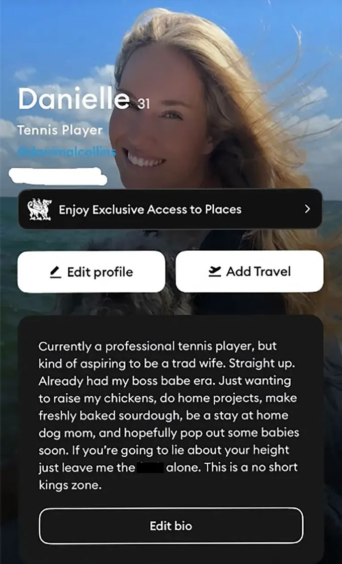 Sau khi chia tay bạn trai Bryan Kipp hơn một năm, tay vợt nữ 31 tuổi quyết định tìm kiếm tình yêu mới qua các ứng dụng hẹn hò. Tuy nhiên, hồ sơ của cô nhanh chóng thu hút sự chú ý bởi những tiêu chí khá kén chọn, đặc biệt là việc loại trừ những người đàn ông “lùn”, hoặc không đủ khả năng T chính để hỗ trợ cô trở thành “bà nội trợ toàn thời gian”.