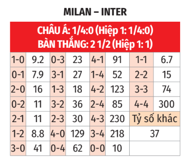 - Từ 2 tới 3 bàn: 5/6 trận Serie A gần đây của Milan có từ 2 tới 3 bàn. 3/4 trận chính thức vừa qua của Inter cũng xảy ra biến cố tương tự. Nếu chỉ tính Serie A và Coppa Italia thì có tới 5/6 trận derby Milan gần nhất chấm dứt 90 phút với tổng bàn thắng rơi vào đoạn từ 2 đến 3.