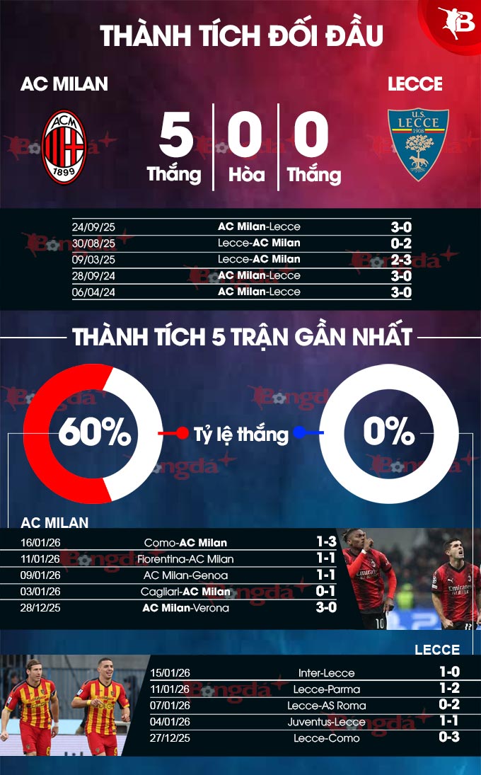 Bên phần sân đối diện, từ sau trận thua 0-2 ở lượt đi, Lecce chỉ thắng được 1 trong 28 lần đối đầu gần nhất với Milan tại giải vô địch quốc gia, và chiến thắng duy nhất đó đã cách đây gần hai thập kỷ. Cuộc chiến trụ hạng đầy cam go của Lecce sẽ tiếp tục vào cuối tuần này, khi họ trở lại thành phố lớn thứ hai Italia chỉ vài ngày sau trận thua trước Inter. Hiện Lecce đang có mạch 5 trận chỉ thua (4) và hòa (1), thành tích khiến họ rơi xuống thứ 17 trên BXH với 3 điểm hơn nhóm cầm đèn đỏ.