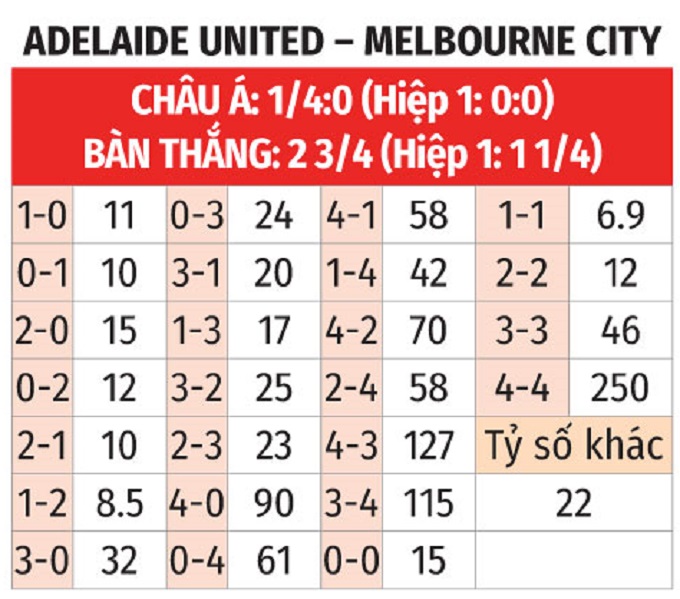 - Ít bàn thắng: Hàng phòng ngự Melbourne City giữ sạch lưới 3/4 trận gần đây, trong khi hàng thủ Adelaide United cũng không để lọt lưới trận ra quân gần nhất. Chưa kể, 3 trận đối đầu gần đây chỉ xuất hiện 2 bàn thắng.