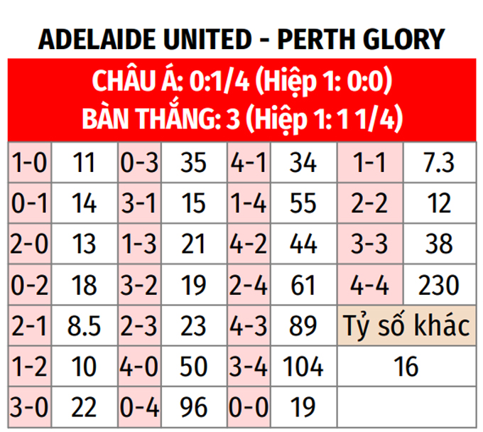 - Lẻ bàn thắng: 7/10 trận gần nhất của Adelaide United có tổng bàn thắng không chia hết cho 2. Ngoài ra, 7/10 trận vừa xong của Perth Glory cũng chứng kiến điều tương tự.