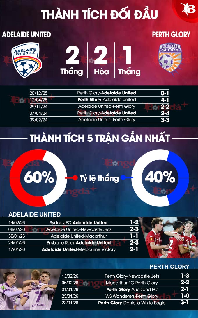 Bên cạnh đó, 10 lần so T gần đây, Adelaide United thắng 6, hòa 3 và thua 1 trước Perth Glory. Chưa hết, 6 lần gần nhất tiếp Perth Glory trên sân nhà, Adelaide United thắng 3, hòa 2 và thua 1 trước đối thủ. Với những gì đang thể hiện, Adelaide United nhiều khả năng sẽ có 3 điểm trên sân nhà.