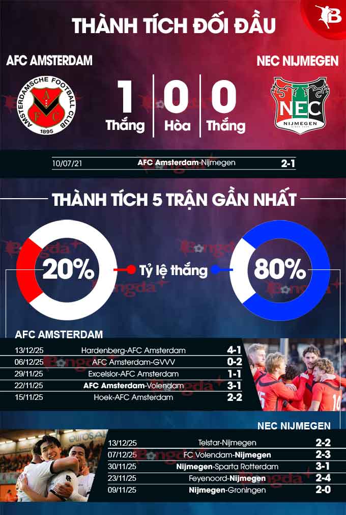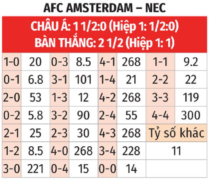 - Nhiều bàn thắng: 7/9 trận gần đây của NEC đều xuất hiện tối thiểu 4 tình huống làm bàn. 4/6 trận vừa qua của chủ nhà AFC Amsterdam cũng xuất hiện tối thiểu 4 lần lưới rung.