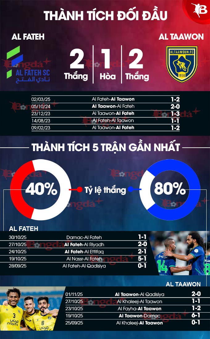 Al Taawon bước vào trận đấu này với thành tích bất bại 8 trận liên tiếp kể từ thất bại trước Al Nassr trong ngày khai mạc mùa giải mới, trong đó có tới 7 chiến thắng. Tại đấu trường Saudi Pro League, Al Taawon đang sở hữu 6 chiến thắng và chỉ 1 trận thua sau 7 vòng đấu để vươn lên thứ 2 trên BXH với 18 điểm, chỉ kém duy nhất Al Nassr 3 điểm. Đây có thể xem là thành công ngoài mong đợi đối với Al Taawon và trước một Al-Fateh đang thi đấu thiếu ổn định, đội khách đang rất tự tin hướng đến thắng lợi.