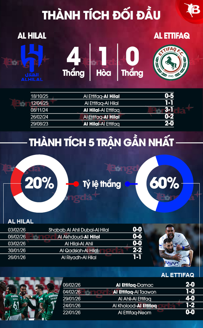 Al Hilal có lợi thế sân nhà và có mạch bất bại ở 10 trận vừa xong (bao gồm 9 thắng và 1 hòa). Trong khi đó, Al Ettifaq thắng 5/10 trận sân khách gần đây.