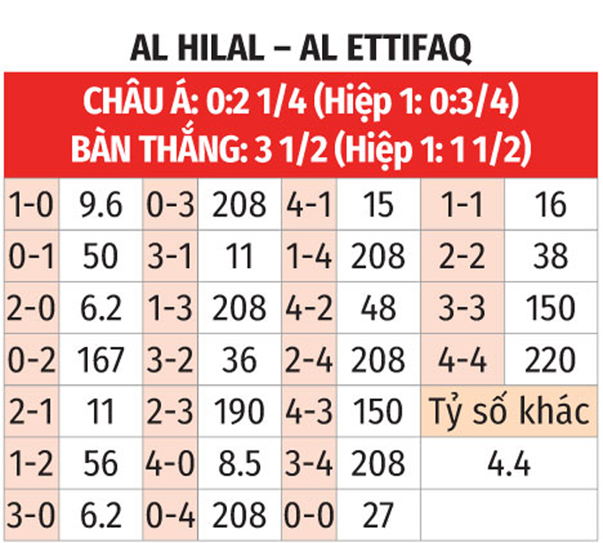 - Chẵn bàn thắng: 7/10 trận đối đầu gần nhất giữa 2 CLB có tổng bàn thắng chia hết cho 2. Chưa hết, 5 trận liên tiếp gần đây của Al Hilal cũng chứng kiến điều tương tự. Đáng chú ý, 6/10 trận gần nhất Al Hilal tiếp Al Ettifaq cũng có tổng bàn thắng là số chẵn.