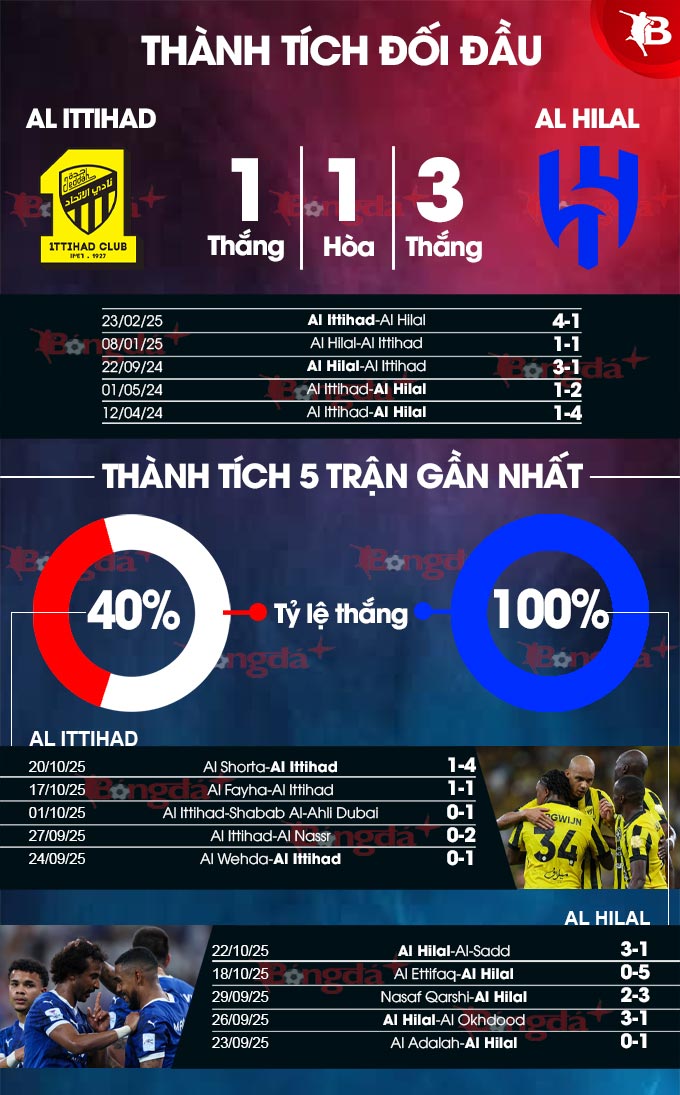 Al-Hilal bước vào trận đấu này với phong độ đáng gờm, kết hợp sự ổn định trong phòng ngự với sự linh hoạt trong tấn công. Al Ittihad có thể tự tin sau chiến thắng gần đây tại đấu trường châu lục, nhưng đoàn quân HLV Simone Inzaghi sở hữu chất lượng và còn có động lực giành chiến thắng để ca khúc khải hoàn.