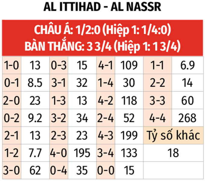 - Ít nhất 2 bàn hiệp 1: Xu thế bùng nổ bàn thắng thường đến sớm, khi 6/10 trận đối đầu gần nhất có tối thiểu 2 bàn trong hiệp đầu. 3/5 trận sân nhà gần đây của Al Ittihad thậm chí có ít nhất 3 bàn trước giờ nghỉ. Với Al Nassr, 9/12 trận vừa qua của đội khách cũng xuất hiện từ 2 bàn trở lên trong 45 phút đầu.