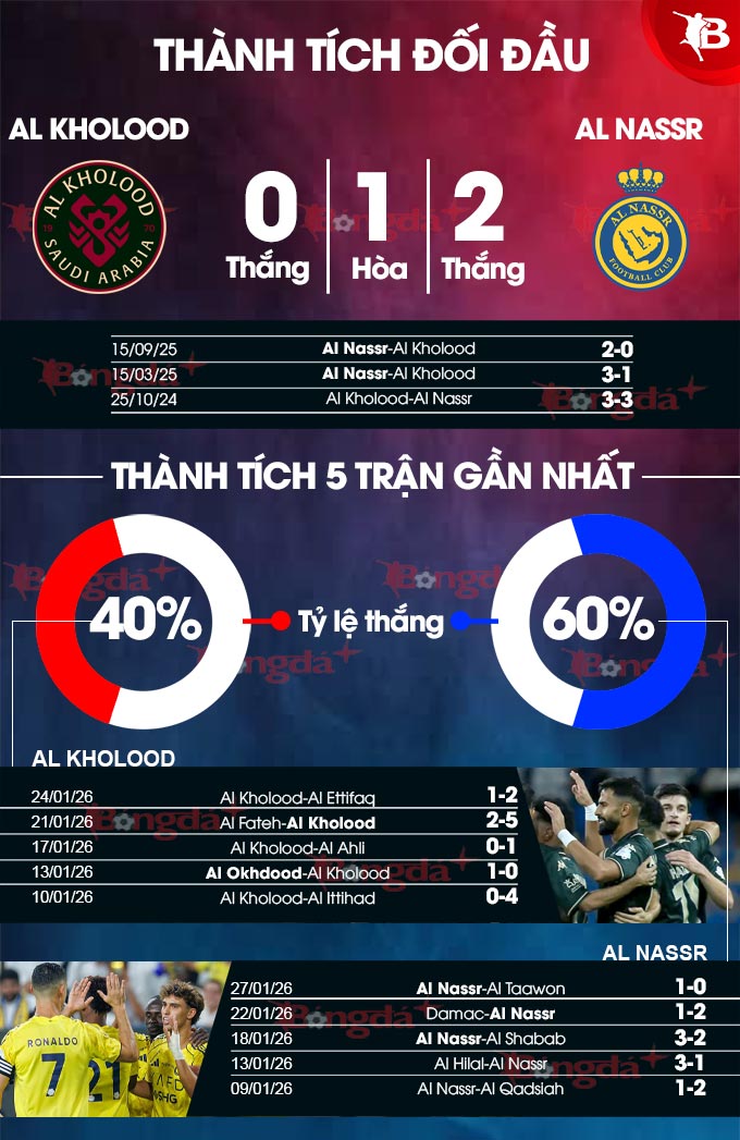 - Nhiều bàn thắng: 10/14 trận gần đây của Al Nassr trên mọi đấu trường đều có từ 4 bàn thắng trở lên. Với Al Kholood, 4/7 trận vừa qua của đội chủ nhà cũng xuất hiện tối thiểu 4 tình huống làm bàn.