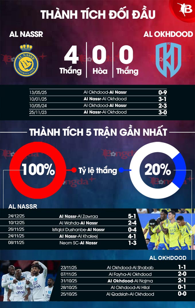 - Nhiều bàn thắng: Hàng công Al Nassr đang thi đấu bùng nổ, ghi ít nhất 4 bàn/trận ở 5/6 trận gần đây trên mọi đấu trường. Lịch sử đối đầu cũng chứng kiến Al Nassr nã vào lưới Al-Akhdoud tới 18 bàn ở 4 lần gần nhất gặp nhau.