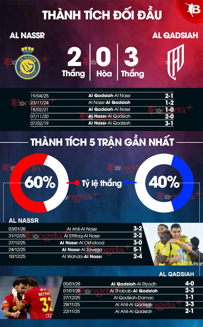 - Nhiều bàn thắng: 11 trận liên tiếp gần đây của Al Nassr cùng 5/6 trận vừa qua của Al-Qadsiah đều có ít nhất 3 bàn thắng được ghi. 7/9 trận đối đầu gần nhất cũng xuất hiện tối thiểu 3 tình huống làm bàn.