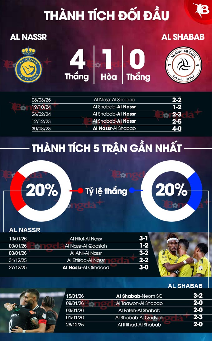 Al-Nassr bước vào trận đấu với phong độ sa sút, điều mà Al-Shabab sẽ xem là cơ hội để thách thức sự thống trị gần đây mà đối thủ đã thể hiện trong các trận đối đầu giữa hai đội và tin rằng họ có thể giành được kết quả tích cực nếu tận dụng những khó khăn gần đây của đội chủ nhà. Tuy nhiên, chất lượng đội hình vượt trội khả năng sẽ giúp Ronaldo và các đồng đội có thắng lợi đầu tiên trong năm 2026.