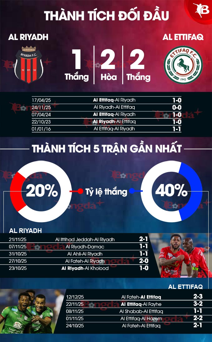 Bây giờ, Al Riyadh và Al Ettifaq sẽ phải cố gắng giành chiến thắng trước đối phương để cải thiện thứ hạng ngay lập tức. Phong độ của Al Riyadh và Al Ettifaq đang rất cân bằng khi chỉ thắng 1/5 trận gần nhất.