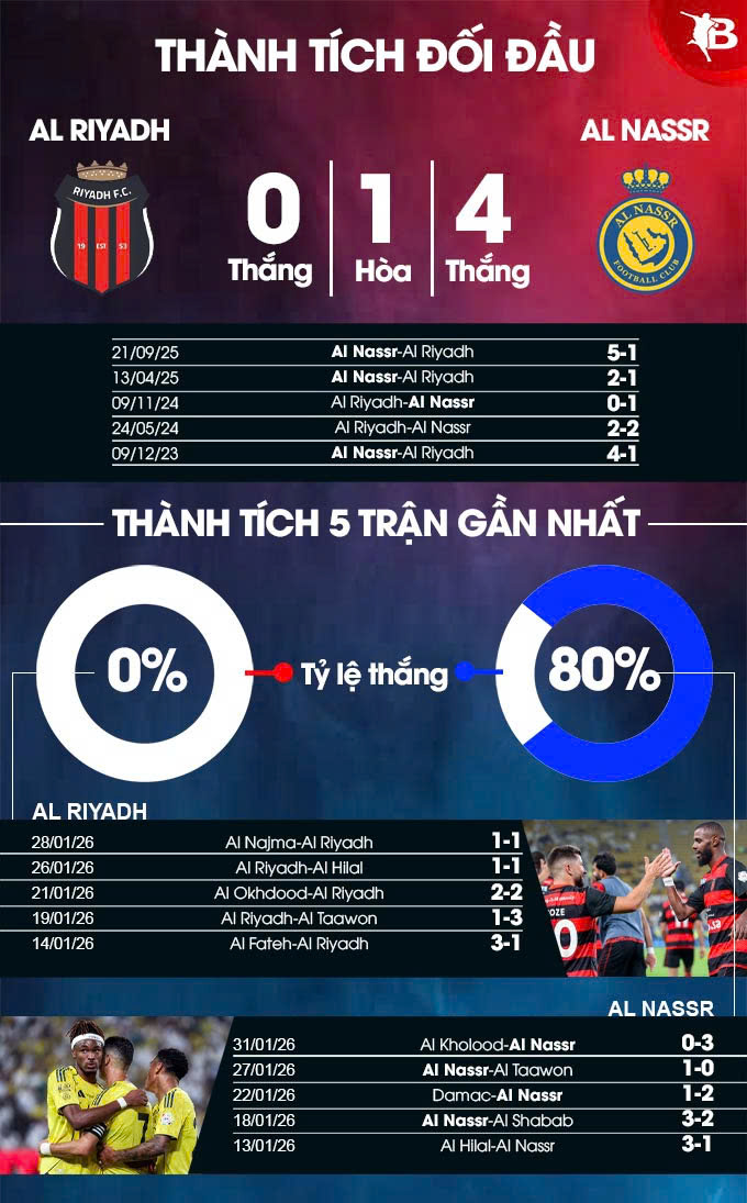 Mặc dù Al Nassr đã trải qua một giai đoạn sa sút ngắn vào đầu năm 2026, khi thua 3 trận liên tiếp, nhưng dường như họ đã trở lại đúng hướng sau khi giành được 3 chiến thắng gần nhất. Trận đấu gần đây của Cristiano Ronaldo và các đồng đội là chiến thắng tưng bừng 3-0 trước Al Kholood, tiếp tục duy trì đà thắng lợi trước chuyến làm khách này.